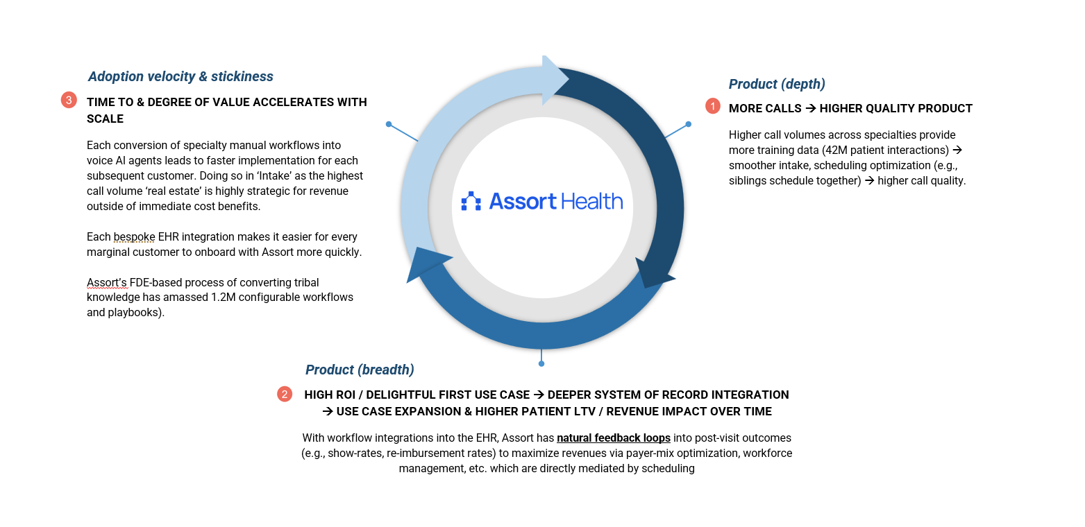 What makes Assort exemplary is that adoption compounds with scale. Each call handled trains the system across edge cases, each new workflow automated makes deployments faster, and each EHR integration lowers friction for future customers. This creates a self-reinforcing flywheel: more usage → higher quality → broader adoption → deeper integration.